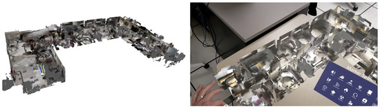 Vertex-shaded color 3D mesh constructed from HoloLens data. Left: The map is rendered in isolation. Right: The same map visualized in Augmented Reality. It is placed on a table, where the user can adjust the location of the AR visualization using a thumb and index finger pinch gesture.