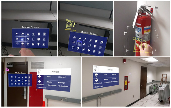 Top: Three images showing the user experience of placing a virtual marker using the EasyVizAR headset. From left to right: (1) the user can select from a variety of marker types, which can be configured beforehand according to user responsibilities, (2) the marker appears as an icon in the AR space synchronized with other EasyVizAR interfaces, and (3) the user can move, rotate, and scale the marker with hand gestures as needed. Bottom: Two examples of virtual navigation signs, which are automatically populated from the navigation mesh and list of location landmarks. The signs are consistent with the surrounding environment. For example, in the left image, a door leading to the stairwell is visible, and in the right image, a fire extinguisher and janitor closet are visible.