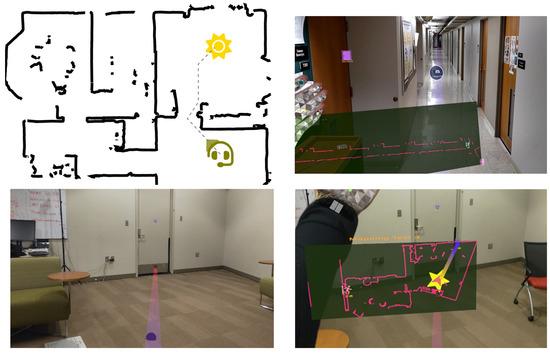 Top Left: Example pathfinding result which successfully routes around walls inferred from a previous exploration of the space from the headset icon to the sun icon destination. Top Right: The AR interface screenshot showing several navigation aids, including landmark icons, a hand-attached map, and a navigation route (transparent line with purple to pink gradient), which leads the user toward the end of the hallway. Bottom Left: A context-aware navigation aid leads the user to a doorway with a path projected on the floor. Small orbs mark waypoints along the path. Bottom Right: The navigation path is visible in the hand-attached map, along with an indicator of the user’s current location and orientation.