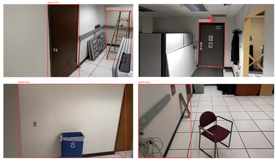 We also tested our object detection with indoor imagery. Our initial experiments suggest that a model like Grounding DINO can be used as a drop-in replacement for our edge-computing object detection pipeline and can be tuned with human-provided input to detect different objects of interest, such as doors or ladders. However, we do observe a tendency for false positives when the objects in the prompt are not present in the scene, as shown in Figure 11. It is unclear at this time whether this is an inherent problem with the feature enhancer, in which language features are used to guide visual feature attention, or whether this can be solved with better training that penalizes false positives. We are interested in exploring this question in more detail in future research.
