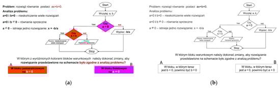 Two versions of the task were prepared to manipulate format: the CC version implemented colour-based signalling (colour and boldface) as guidelines, whereas the BW version was presented without these guidelines (i.e., the black-and-white version), with all other layout aspects kept identical across the two formats. The task required a presentation of the solution of a linear equation in the ax + b = 0 form with the flowchart. The instructions included an analysis of the problem. The solution required verification of the correctness of the conditions written in the indicated blocks. The students selected one of two answers. The pieces of information corresponding with one another were included in the answer blocks, and in the flowchart, they were indicated with the same colour (see Figure 1).