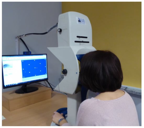 An eye tracker from SensoMotoric Instruments, Teltow, Germany (iViewX™ Hi-Rate 500/1250), recording data at a temporal resolution of 500 Hz, was used in the investigation (see Figure 2). The system included a head-stabilizing interface that minimized head movement without restricting the participant’s field of vision. Stimuli were presented on a 23-inch LCD monitor with a full HD resolution of 1920 × 1080 pixels. Before each test, a 9-point calibration with validation was performed. Environmental conditions were kept consistent across all participants. The experiment was conducted using the SMI Experiment Suite™ 360 software. The experimental design was created in SMI Experiment Center™ 3.4, data recording was carried out with SMI iView X™, and results were processed using SMI BeGaze™ 2.4.