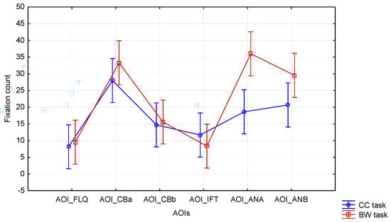 The analysis of variance conducted for the dependent variable—fixation count—showed that participants made fewer fixations on average within the areas of the key task elements in the colour-coded (CC) format (M = 16.97) than in the black-and-white (BW) format (M = 22.04), and this difference was significant (F(1, 240) = 6.89, p = 0.009). There was also a significant difference in fixation count across AOIs (F(5, 240) = 15.69, p < 0.001). Moreover, a significant interaction effect between AOI area and task format was found (F(5, 240) = 2.39, p = 0.039). These results indicate that the fixation count within specific areas depended significantly on the material format. This effect is also illustrated in Figure 3.
