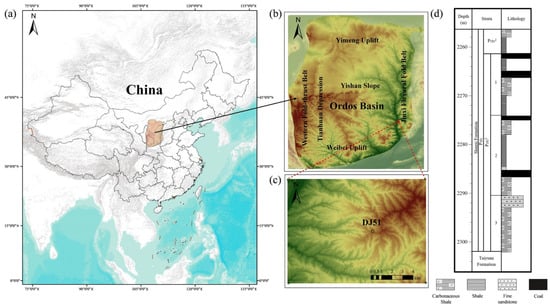 Regional and Local Geological Setting of the Da Ning–Ji Xian Area, Ordos Basin [43]. (a) Location of the Ordos Basin in China. (b) Regional structure map of the Ordos Basin. (c) Tectonic map of the study area. (d) Stratigraphic maps of the Shan-2 in the Shanxi Formation in DJ51.