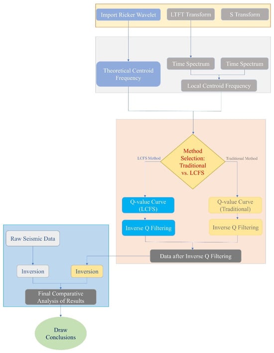 The substantial difference between the S-transform and LTFT arises from their fundamental approaches to time–frequency localization. The S-transform employs a fixed window for all frequencies, which can smear rapid temporal variations in high-frequency components, leading to inaccurate spectral representations. In contrast, the Local Time–Frequency Transform (LTFT) is adaptive, providing variable local resolution along the time axis and incorporating shaping regularization to stabilize the least-squares solution. This enables LTFT to extract a high-fidelity spectrum that accurately reflects the evolving characteristics of the seismic signal. Consequently, the local centroid frequency—the cornerstone of the LCFS method—can be precisely estimated. As shown in Figure 5, the centroid frequency derived from the LTFT spectrum (blue line) closely follows the theoretical reference (gray line), accurately reproducing the smooth downward trend due to attenuation. By contrast, the S-transform (red line) exhibits systematic overestimation and introduces non-physical high-frequency artifacts due to its smeared spectral representation. This comparison demonstrates that the enhanced resolving capability of LTFT is the decisive factor, establishing it as the most reliable foundation for the proposed workflow.