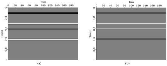 To assess the practical applicability of the LCFS method, it was first tested using a challenging synthetic dataset—a 2D seismic model constructed to replicate the geological characteristics of the study area (Figure 3a). This synthetic model, featuring a constant background Q and multiple reflectors at key intervals (0.1 s, 0.3 s, 0.4 s, and 0.6 s), served as a controlled environment for evaluating the method’s fundamental capabilities, with the topmost layer treated as non-attenuative.