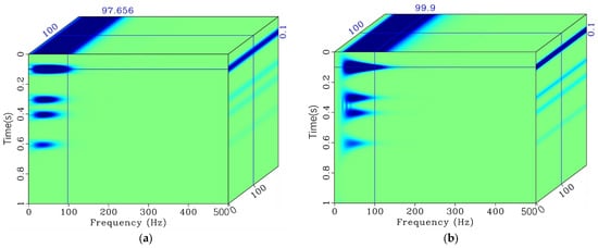 Comparison of time–frequency spectra for a synthetic seismic trace, derived from (a) the Local Time–Frequency Transform (LTFT) and (b) the S-transform. The color represents the spectral amplitude, with dark blue indicating higher values and green indicating lower values, to highlight the comparative effect.