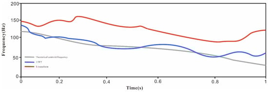 Comparison of the theoretical centroid frequency (gray line) with results from the LCFS method (blue line) and the S-transform method (red line). The LCFS result shows excellent agreement with the theoretical value, while the S-transform result is systematically overestimated.