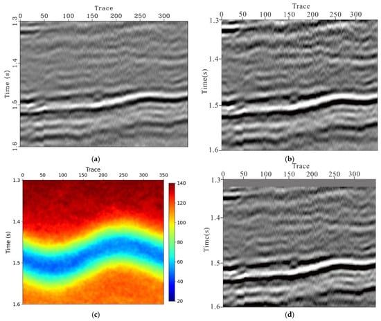 With this fundamental challenge addressed, the complete LCFS algorithm was implemented. The estimated Q-field was subsequently used to perform inverse-Q-filtering, effectively compensating for attenuation effects. The compensated section (Figure 3b) clearly demonstrates the effectiveness of the proposed method. The previously distorted signal shows substantial improvement: amplitudes are consistently recovered, phase continuity is restored, and the seismic image exhibits enhanced resolution that reveals fine structural details. This synthetic validation not only confirms the theoretical soundness of the LCFS approach but also demonstrates that, with an appropriate methodological design—particularly in the time–frequency domain—the framework can effectively mitigate attenuation effects and restore the physical integrity of seismic data.