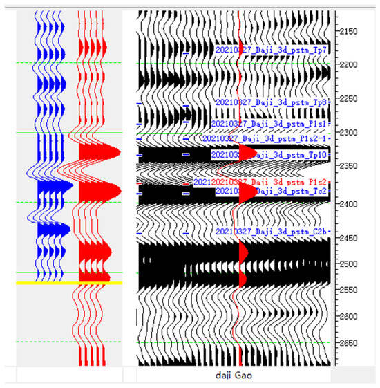 The panel on the right displays the surrounding seismic section, illustrating how the calibrated trace ties into the broader structural context. For clarity, the figure emphasizes the relative alignment of reflection events rather than absolute recording time; thus, the time axis was omitted intentionally to maintain focus on waveform correspondence within the target zone. The excellent match in the Shan-23 interval provides a high-confidence validation of the compensation and ensures the robustness of the subsequent inversion results.