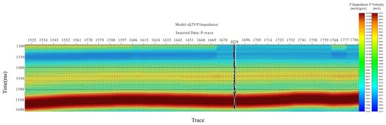 The integrity of this low-frequency model is ultimately anchored by its precise tie to the ground-truth well data. As demonstrated in Figure 10, the overlaid P-wave log from well DJ29 exhibits an excellent match with the interpolated background model. This confirms that our methodology accurately captures both the vertical velocity trends and the absolute velocity values at the well location. Consequently, this robust, well-calibrated foundation is essential for ensuring the stability and accuracy of the final impedance inversion result. The synergy of this integrated framework is further validated in the subsequent critical quality control step, where the well logs, this low-frequency model, and the final high-resolution inversion result all show excellent agreement, thereby confirming the internal consistency of the entire workflow.