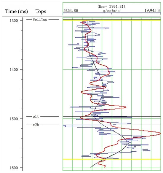 The smooth black curve represents the low-frequency model, which establishes the essential long-wavelength trend. Conversely, the jagged blue curve is the original, high-frequency P-impedance well log, representing the ground-truth data we aim to honor. The red curve illustrates the final, high-resolution inversion result, which effectively integrates the low-frequency model with the high-frequency information derived from the seismic data.