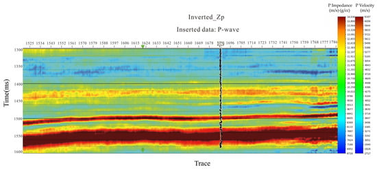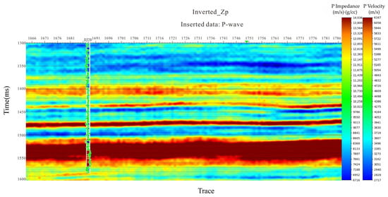The construction process involved kriging the P-wave velocity, S-wave velocity, and density logs along a framework of key interpreted horizons. This ensured that the resulting long-wavelength trends accurately reflect the established stratigraphy. Here, kriging denotes a geostatistical interpolation technique that predicts property values at unsampled locations by exploiting the spatial correlation structure among existing data. The method uses a variogram model to assign statistically optimal weights to nearby samples, thereby minimizing estimation variance. In this study, kriging was employed to interpolate the well-log–derived velocity fields across the interpreted horizons, ensuring that the resulting volumes are both geologically consistent and statistically robust. Figure 10 presents a cross-section through the resulting P-velocity volume, which functions as the foundational low-frequency component for the P-impedance inversion. The model distinctly captures the expected large-scale velocity layering: lower velocities in the shallower section (indicated by blue and green hues) gradually transition to higher velocities at depth. A prominent high-velocity layer (deep red) is evident below 1500 ms, which is highly consistent with regional geological knowledge.