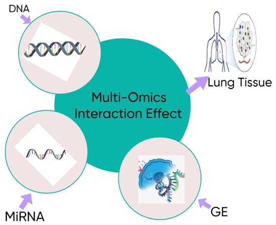 Impact of multi-omics interactions in human lung tissue, highlighting the potential interactions between GE, miRNA, and DNA methylations layers.