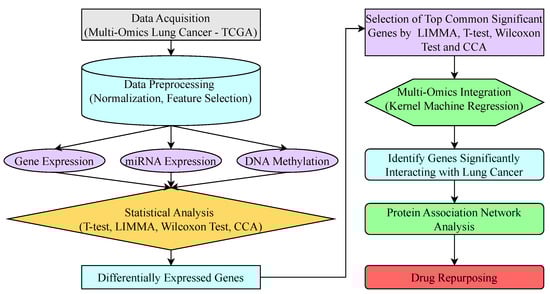 The section presents the proposed methodology, summarized in Figure 2. A key innovative aspect of our workflow is the integration of a multi-test, consensus-based feature selection process prior to the application of KMR to model higher-order interactions. The process begins with data acquisition from the Multi-Omics Lung Cancer—TCGA database. The raw data undergo preprocessing, including normalization and feature selection, and are then divided into three categories: GE, miRNA expression, and DNA methylation. Each category is analyzed using statistical methods such as LIMMA, T-test, CCA, and Wilcoxon test to detect genes with significant differential expression. The top common significant genes are selected across these tests from each category. These genes are then integrated using KMR to identify genes significantly interacting with lung cancer. Finally, the results are analyzed through protein association network analysis and, ultimately, drug repurposing. The details of various methods are explained in the following subsections.