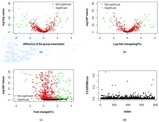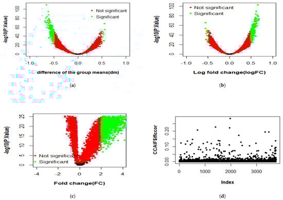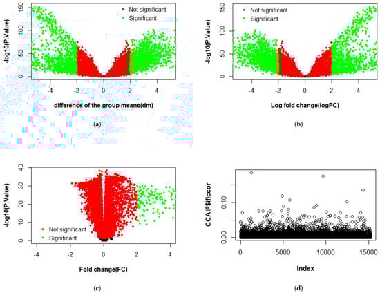 Figure 3, Figure 4 and Figure 5 present the results of the analysis of differential gene expression (DEG), miRNA expression, and DNA methylation data, respectively. The differential GE analysis presented in Figure 3 was performed using four statistical methods: (a) T-test, (b) LIMMA, (c) Wilcoxon test, and (d) CCA. For the T-test, LIMMA, and Wilcoxon test, the null hypothesis () assumes no significant difference between groups. Genes were considered differentially expressed if p-value < 0.05 with sufficient effect size, defined as an absolute difference between group means (dm), log fold change (logFC), or fold change (FC) exceeded 2 for the T-test, LIMMA, and Wilcoxon test, respectively. Likewise, the same four methods were used to analyze miRNA expression in Figure 4 and DNA methylation data in Figure 5. For miRNA data, features were deemed significant if p < 0.05 with , , or , while for DNA methylation data, a smaller threshold of , , or was used due to the typically subtle magnitude of methylation changes. In the volcano plots across three datasets, the x-axis represents the effect size (dm, logFC, or FC, depending on the method), and the y-axis represents statistical significance (), with each point representing a gene, miRNA, or methylation feature. Green points represent significant features where was rejected, while red points indicate non-significant features. In contrast, CCA evaluates linear relationships, with assuming no correlation between feature sets, and showed weak correlation across three datasets.