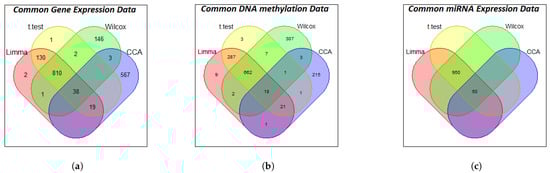Venn diagrams illustrating the number of genes selected by T-test, LIMMA, Wilcox, and CCA methods for the different data types: (a) gene expression; (b) DNA methylation; and (c) miRNA expression.