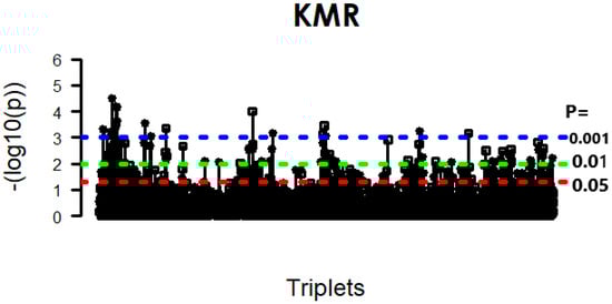 After performing this initial screening on each omics layer, our next critical step was to distill these results into a high-confidence set of features for our main interaction analysis. Consequently, features that were consistently detected as significant across all four statistical methods were identified for further analysis. Figure 6 shows the Venn diagram of the t-test, CCA, Wilcoxon test, and LIMMA methods for three datasets: GE, miRNA expression, and DNA methylation data. The figure shows that, for the GE data, 1000 genes were exclusively selected by all four methods, whereas for the DNA methylation data, 1000 genes were exclusively selected by all four methods except CCA, which selected 260 genes. For miRNA expression data, CCA exclusively selected the least number of genes (50), while the other three methods selected 1000 genes. Interestingly, 38, 50, and 18 genes were commonly selected by all four methods for GE, miRNA expression, and DNA methylation data, respectively. Based on these high-confidence feature sets, the KMR model was applied to the core analysis to evaluate significant three-way interactions among the 34,200 (38 × 50 × 18) possible triplets. The overall results of the KMR analysis are visualized in the Manhattan plot in Figure 7, which reveals 234 significant triplets at a significance level of p < 0.05, and the strong, scattered and double-dotted lines in Figure 7 represent p-values of 0.05, 0.01, and 0.001, respectively.