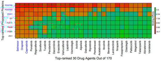 To achieve this objective, in silico molecular docking analysis was conducted to identify potential drug candidates for lung cancer treatment, emphasizing top-ranked target proteins and selected compounds. A total of 190 meta-drug agents were collected through an extensive literature review of acute myeloid leukemia (AML)-related studies (see Table S1) to identify potential repositioning candidates. The 3D structures of target proteins were obtained from the Protein Data Bank (PDB) [49] and SWISS-MODEL [50] databases, while the 3D structures of the drug compounds were retrieved from the PubChem database [51]. The “Discovery Studio Visualizer” was used to visualize the 3D structures of protein interfaces [52]. PDB2PQR and H++ servers were utilized to assign the protonation state of target proteins [53]. All the missing hydrogen atoms were also appropriately added. The pKa for target proteins residues were investigated under the physical conditions of salinity = 0.15, internal dielectric = 10, pH = 7, and external dielectric = 80. On the other hand, the drug agents were minimized energy through the Avogadro [54]. The target proteins were solvated with water, and only polar hydrogens were added. The receptor grid boxes (in X, Y, Z dimension) were prepared in the ADT4.2, and the pdbqt files of proteins were generated [55]. Similarly, the drug agents were prepared with default parameters, and only Gasteiger charges were added. Subsequently, molecular docking between receptors and drug agents were performed to calculate their binding affinities (kcal/mol) by using AutoDock Vina (v1.1.2) [56]. Flexible-ligand docking was carried out using the Lamarckian Genetic Algorithm with an exhaustiveness value of 8. The contributions of hydrogen bonding, hydrophobic, ionic, and van der Waals interactions were evaluated to determine the binding free energy (), representing the ligand–protein affinity score. Docking poses were refined and ranked based on calculated binding energies. For the details of the drug screening procedure see our previous published papers [57]. Following docking, the top-ranked protein–ligand complexes were analyzed for their interaction profiles and binding site characterization. Two-dimensional interaction diagrams were generated using Discovery Studio Visualizer [58], highlighting key non-covalent interactions. Compounds exhibiting the highest binding affinities and favorable interaction profiles were prioritized for further ADMET (Absorption, Distribution, Metabolism, Excretion, and Toxicity) evaluation.