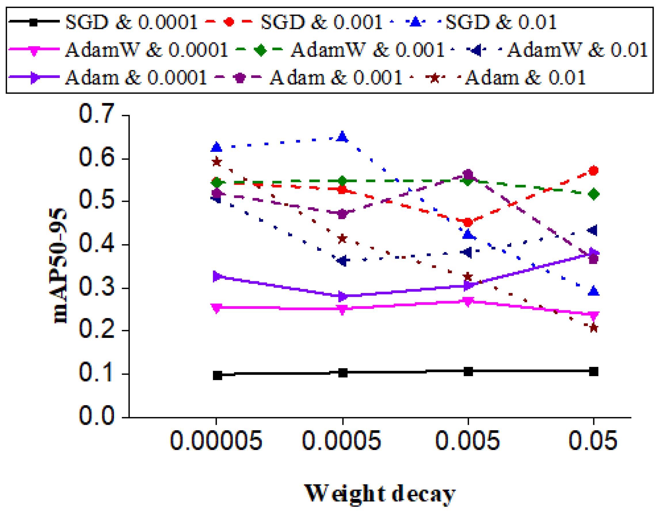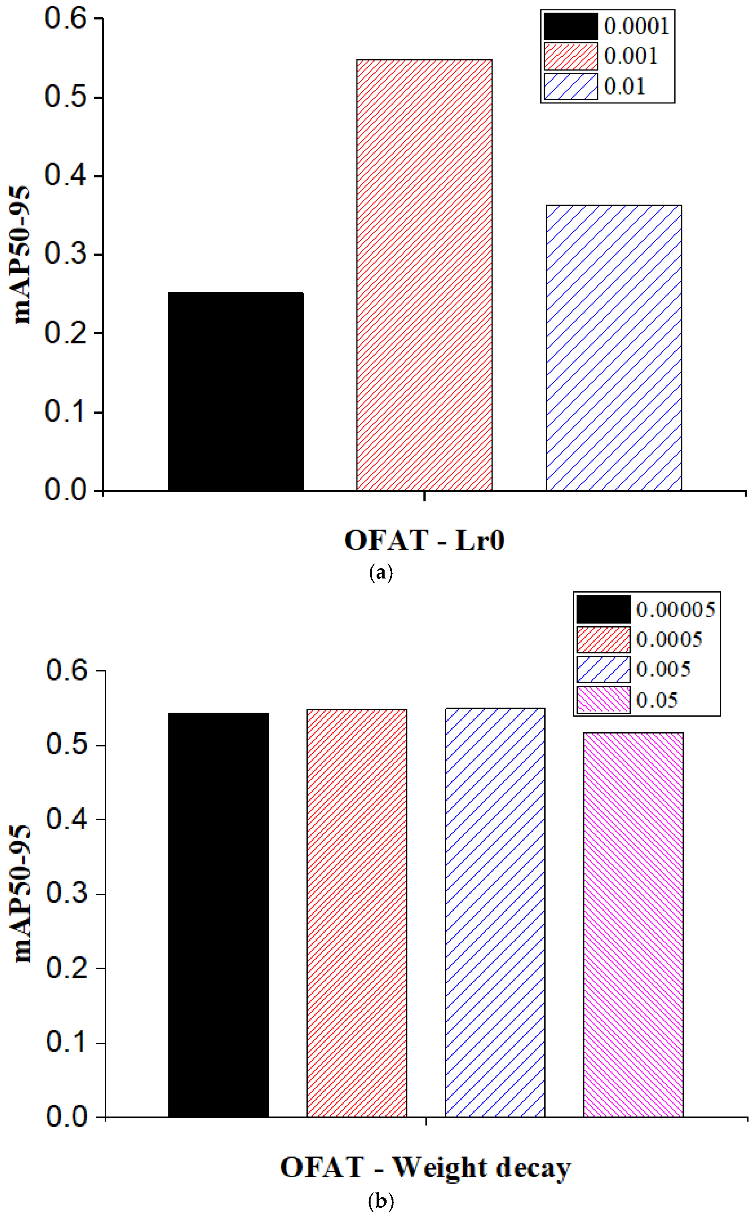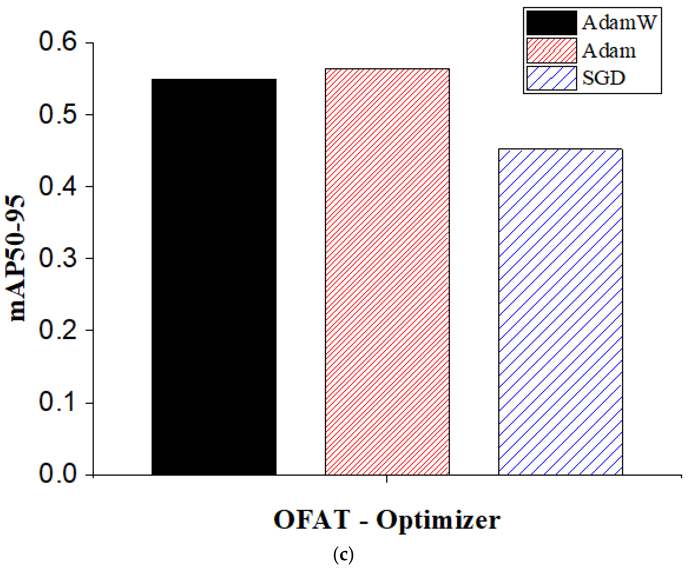 - Moraes, A.M.; Pugliese, L.F.; Santos, R.F.D.; Vitor, G.B.; Braga, R.A.D.S.; Silva, F.R.D. Effectiveness of YOLO architectures in tree detection: Impact of hyperparameter tuning and SGD, Adam, and AdamW optimizers. Standards 2025, 5, 9. [Google Scholar] [CrossRef]