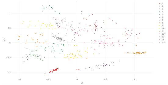k-means algorithm. The visualization highlights clusters by distinct colors, showing how semantically related words are grouped in close proximity. Based on model selection criteria, a total of 15 clusters were identified as valid. As shown in