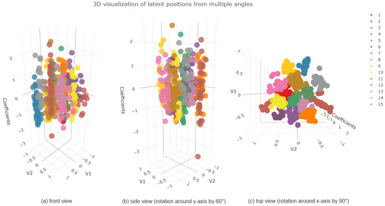 Figure 3 presents a three-dimensional visualization, where the horizontal axes represent the latent positions of words and the vertical axis corresponds to their regression coefficients. Each colored dot denotes a single word, and the color indicates its cluster membership consistent with the grouping shown in