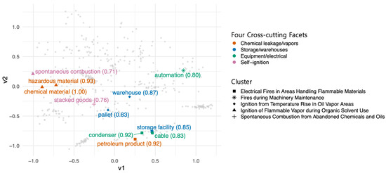 Table 4 presents the top 10 representative keywords for each cluster, arranged according to their proximity to other words within the same cluster. This ordering enables a more precise characterization of the distinctive features of each cluster. While the identified clusters are not directly labeled as specific fire causes, their semantic coherence often reflects shared causal contexts. Accordingly, these clusters can be interpreted as data-driven representations of latent cause structures underlying fire incidents. Cluster 1 is anchored by the central term