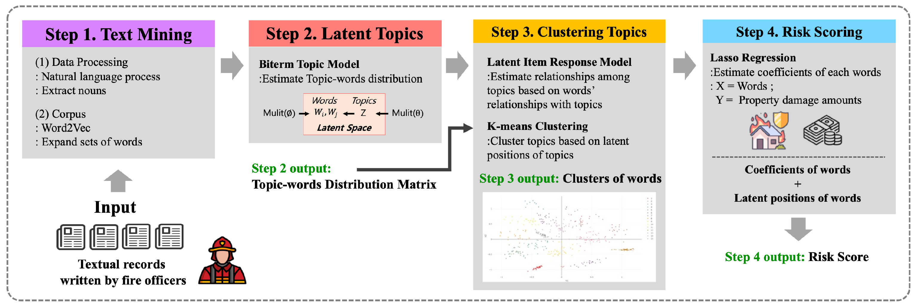In the final step (Step 4), structured data on property damage amounts are incorporated into the analysis. Specifically, Lasso regression is used to estimate coefficients linking each word to the magnitude of property loss. Words with higher coefficients can thus be interpreted as risk factors associated with greater expected damages. Beyond word-level inference, this integration allows for cluster-level analysis: by examining the aggregated coefficients of words within each cluster, we can identify which semantic groupings correspond to high-risk factors in terms of potential financial losses. Taken together, this framework not only provides a systematic way to quantify fire risk from unstructured narratives, but also bridges semantic information extracted from text with structured loss data to yield interpretable and practically meaningful risk indices.