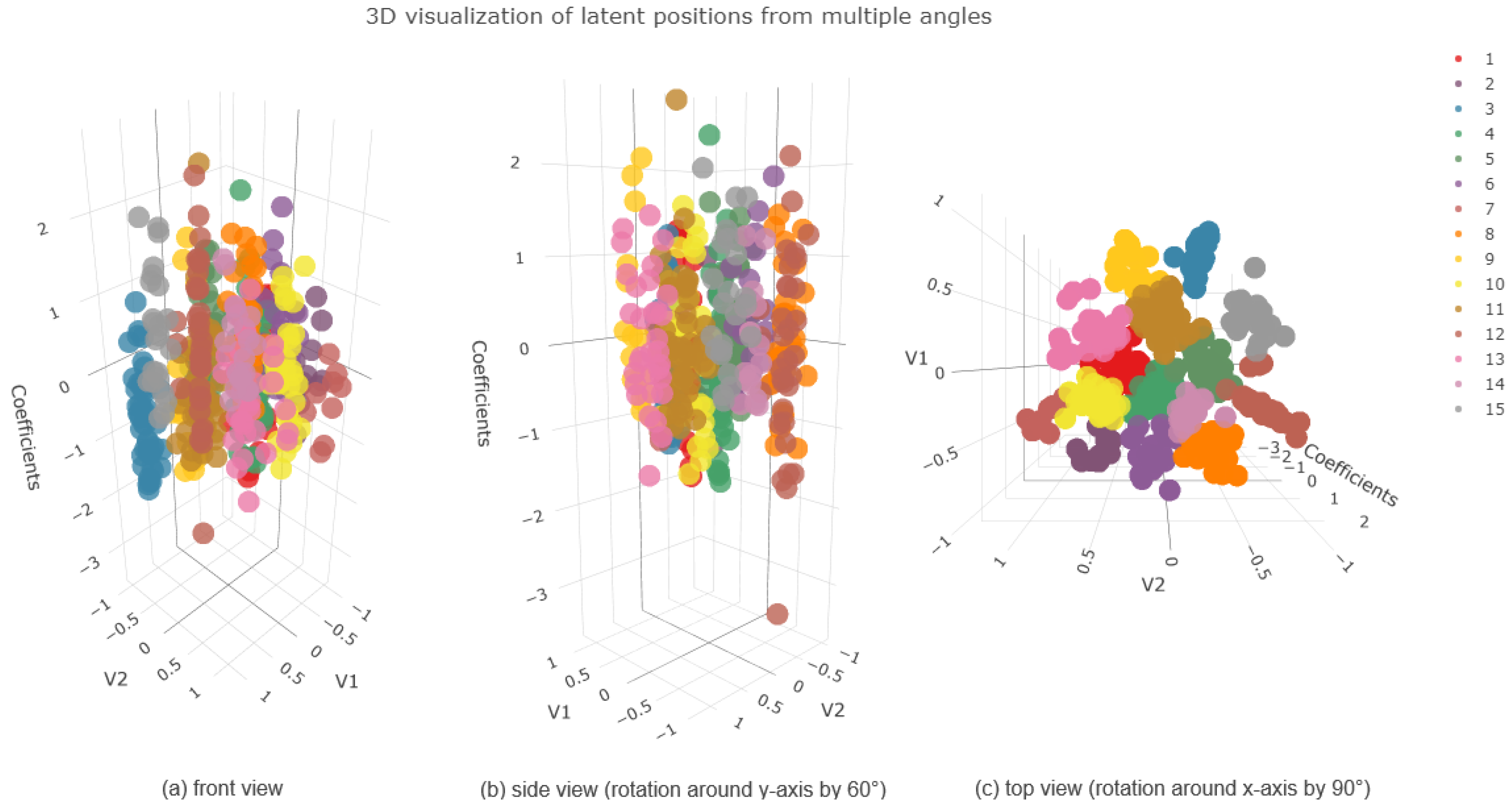 where x i , p denotes the probability of word i belonging to topic p. The parameters a i and b p represent the intrinsic activity of word i (i.e., how generally a word tends to appear across topics) and the popularity or overall strength of topic p, respectively. The Euclidean distance | | v i u p | | measures how semantically close the word and topic are in the latent space, where smaller distances indicate stronger associations. Bayesian inference is employed to estimate the full parameter set Θ = { a , b , U , V } with appropriate priors, and parameters are sampled using Markov chain Monte Carlo (MCMC). As a result, we obtain latent positions of topics v i in R d , forming the topic coordinate matrix A R d × P .