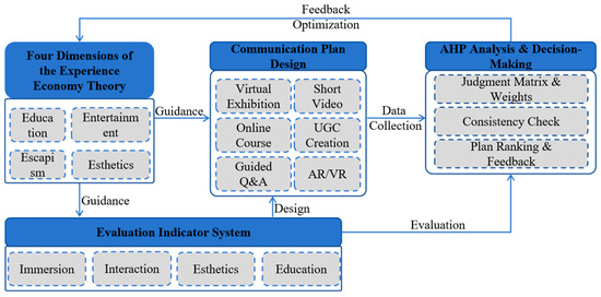 This study employs a mixed-methods research design, integrating both qualitative and quantitative approaches to construct a “theoretical modeling–empirical evaluation–optimization strategy” research framework. This research is conducted in four phases: (1) constructing an evaluation index system based on experience economy theory; (2) determining indicator weights using the Delphi method and AHP; (3) collecting user experience data via questionnaire survey; (4) synthesizing analysis and proposing optimization strategies. The research framework is illustrated in Figure 2. This framework emphasizes a cyclic and iterative process of “theory-driven, data-supported, practice-oriented” research, ensuring both academic rigor and practical relevance.