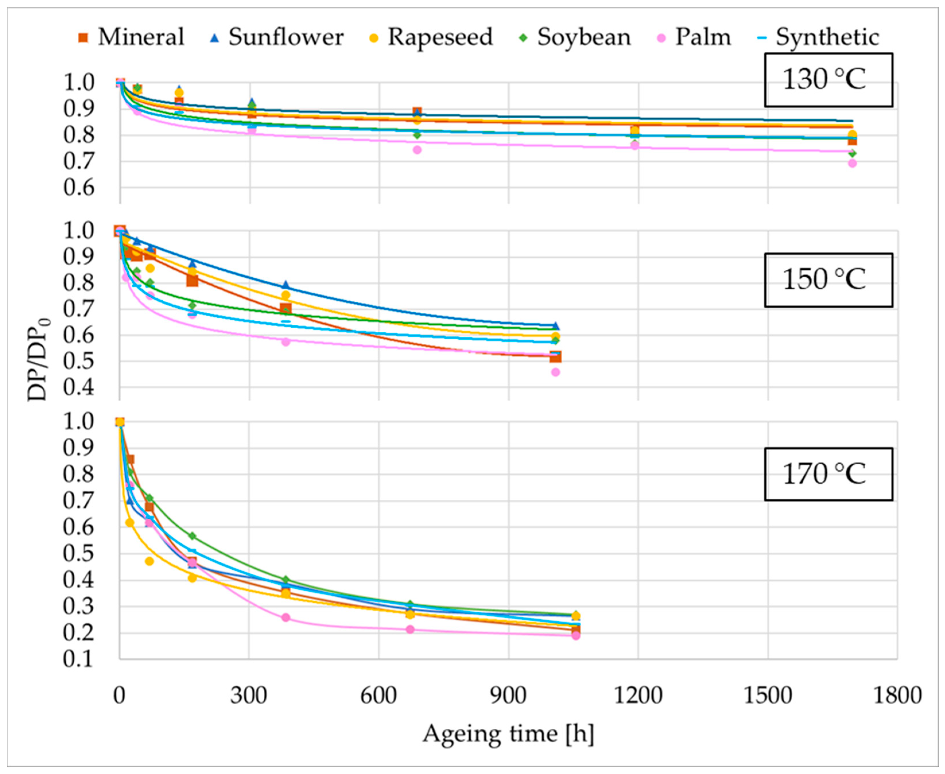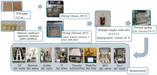 38] focused on the comparison of kraft and TUK papers impregnated with different dielectric fluids aged at 150 °C, the present work further investigates the behaviour of TUK paper impregnated with various fluids aged at three constant temperatures and includes analysis in accordance with current standards providing a more comprehensive assessment of its performance. The novelty of this study lies in the simultaneous analysis of TUK paper aged with five EF—four NE of different origins, including a palm ester modified to a monoester to improve its properties, and one SE—while using MO as a benchmark, at three representative temperatures (130 °C, 150 °C, and 170 °C). The degradation of the solid and liquid insulation was assessed through the DP of the TUK paper and the measurement of the main chemical (moisture, acidity), physical (interfacial tension (IT), viscosity, and flash and fire points), and dielectric (breakdown voltage (BDV), dissipation factor (tan δ)) properties of the fluids, all interpreted with respect to the maintenance standards—IEC 60422 for MO, IEC 62975 for NE, and IEC 61203 for SE. This experimental design not only enables a rigorous evaluation of how fluid origin influences both paper degradation and fluid behaviour under well-controlled conditions but also provides critical evidence to determine whether current diagnostic criteria adequately reflect the actual ageing state of EF-filled systems.