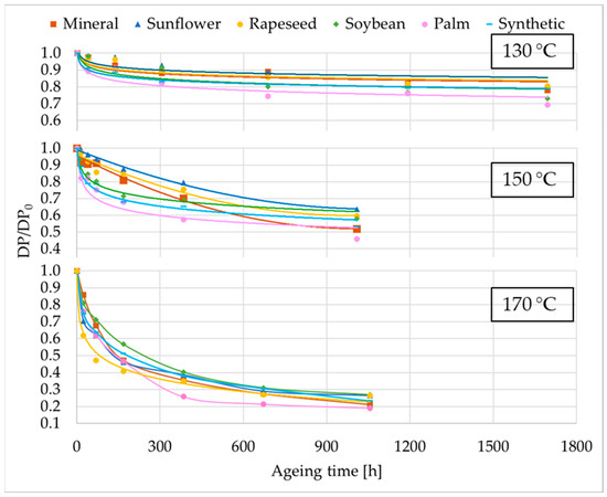 The evolution of the relative DP of the TUK paper impregnated with different dielectric fluids is shown in