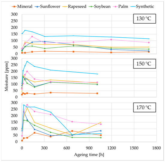 29]. For example, in the sunflower ester, moisture increased from around 30 ppm to 100 ppm at 130 °C and up to 230 ppm at 170 °C; similar patterns were observed for the rapeseed and soybean esters, with initial values between 40–50 ppm rising to over 260 ppm at the highest temperature.