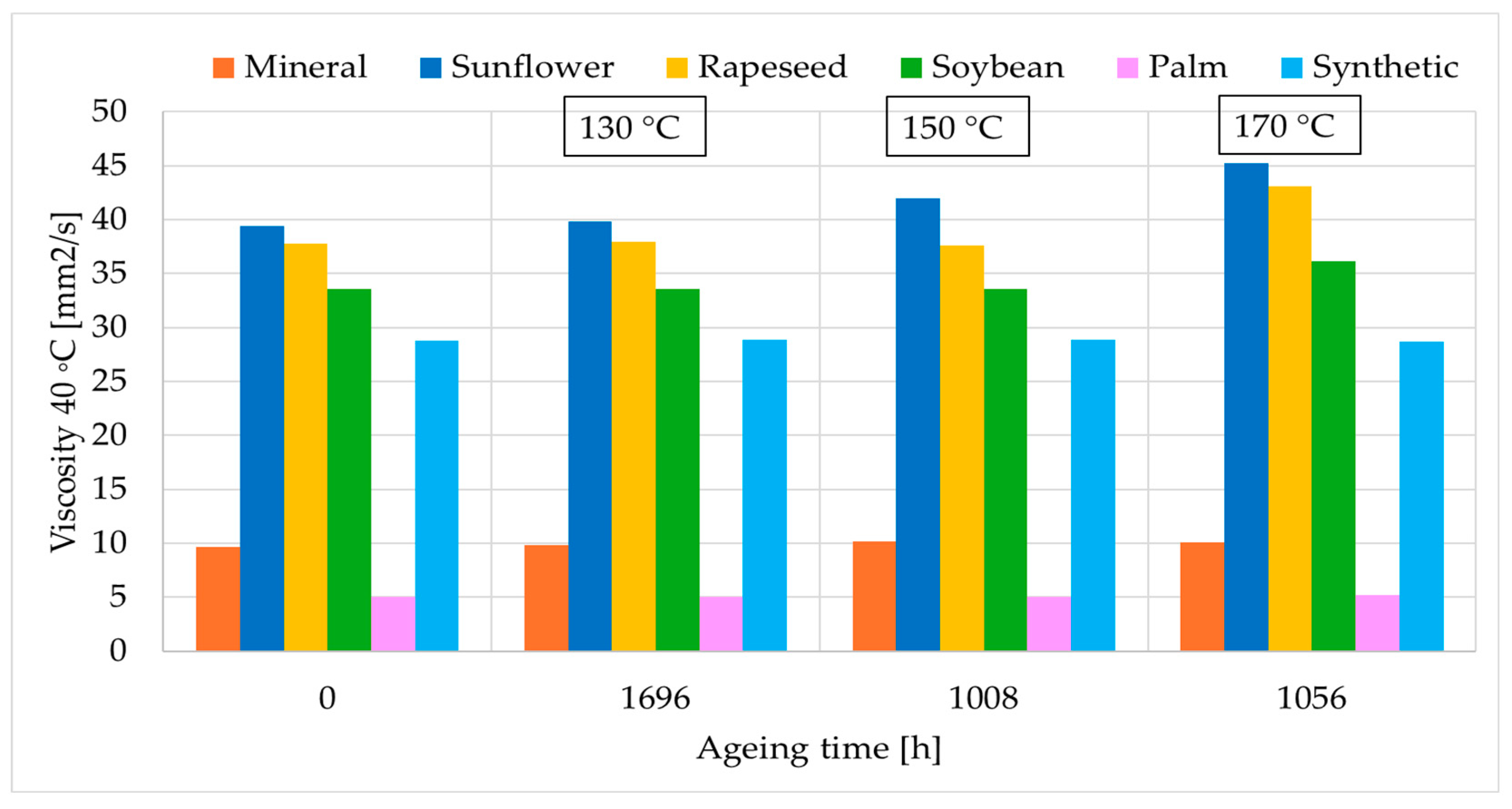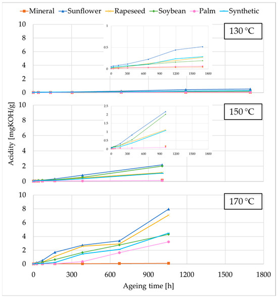 Figure 4. This parameter increased during thermal ageing, although the magnitude and rate of this increase varied considerably between fluid types. In their unused state, all fluids exhibited very low acidity values (mg KOH/g), specifically 0.0107 for MO, 0.078 for sunflower NE, 0.0387 for rapeseed NE, 0.0477 for soybean NE, 0.0060 for palm NE, and 0.036 for SE.