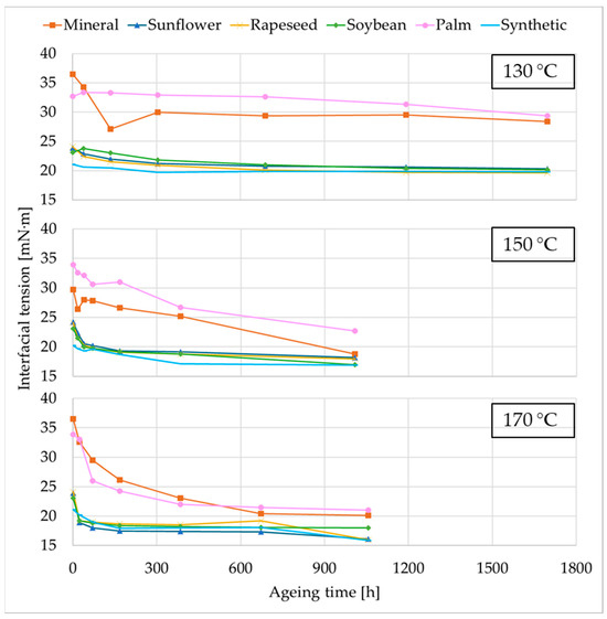 Figure 5 for each ageing temperature. As can be observed, this property decreased with the degradation, particularly in the early stages, reflecting the accumulation of polar degradation by-products in the system. Moreover, the reduction becomes more pronounced as the temperature increases. This parameter is strongly influenced by fluid polarity and the presence of polar contaminants [