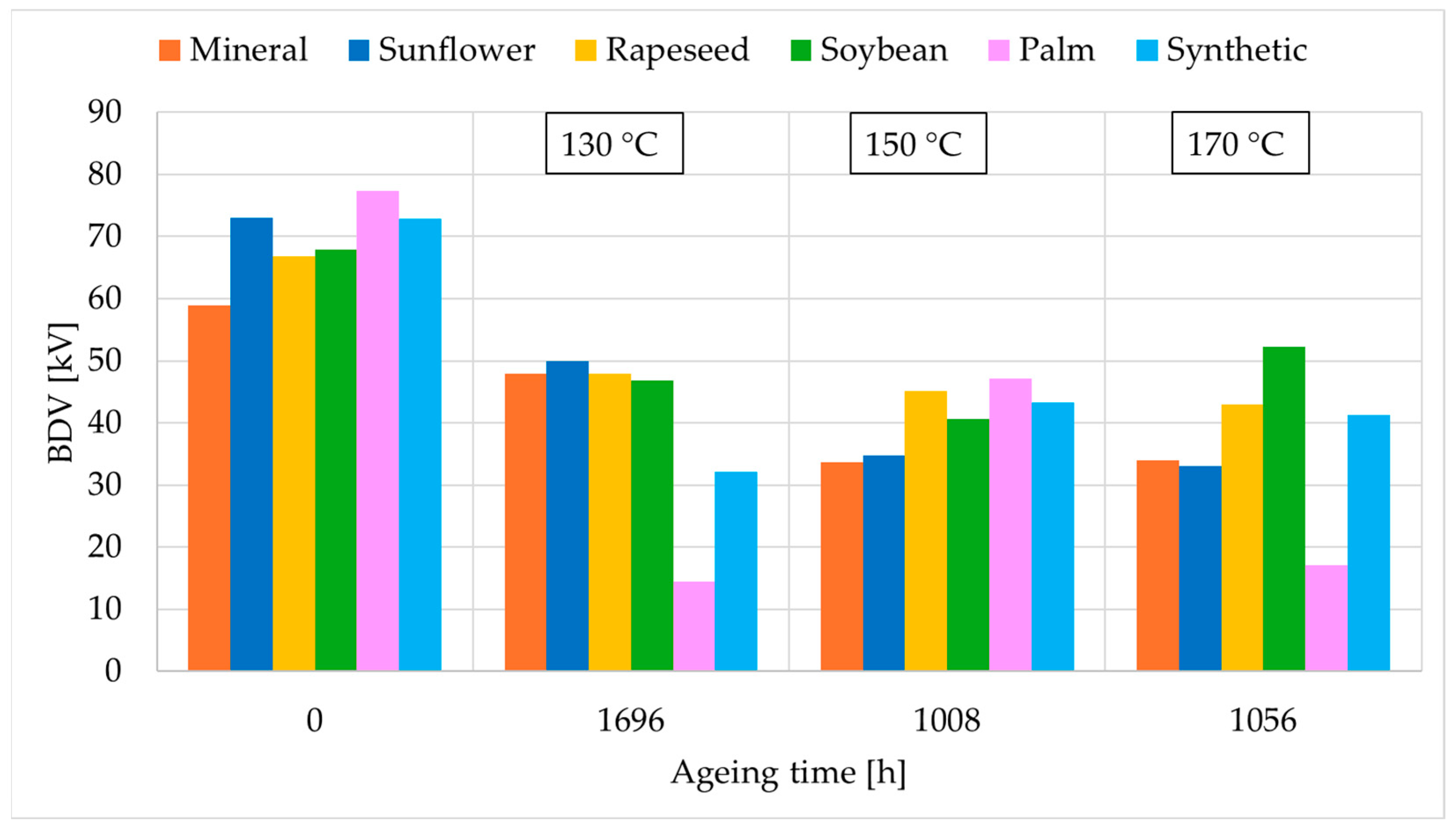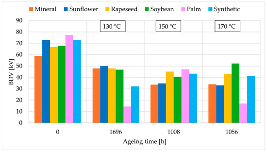 Figure 8 collects the BDV results obtained in this study for the new samples and at the last state of each ageing temperature. Initially, all EF exhibited higher BDV than MO, with the palm NE showing the highest value followed by the sunflower NE and the SE. In detail, the initial values of the BDV [kV] were 56.8, 73.0, 66.9, 67.9, 77.3, and 72.9 for MO, sunflower, rapeseed, soybean, palm, and SE, respectively.