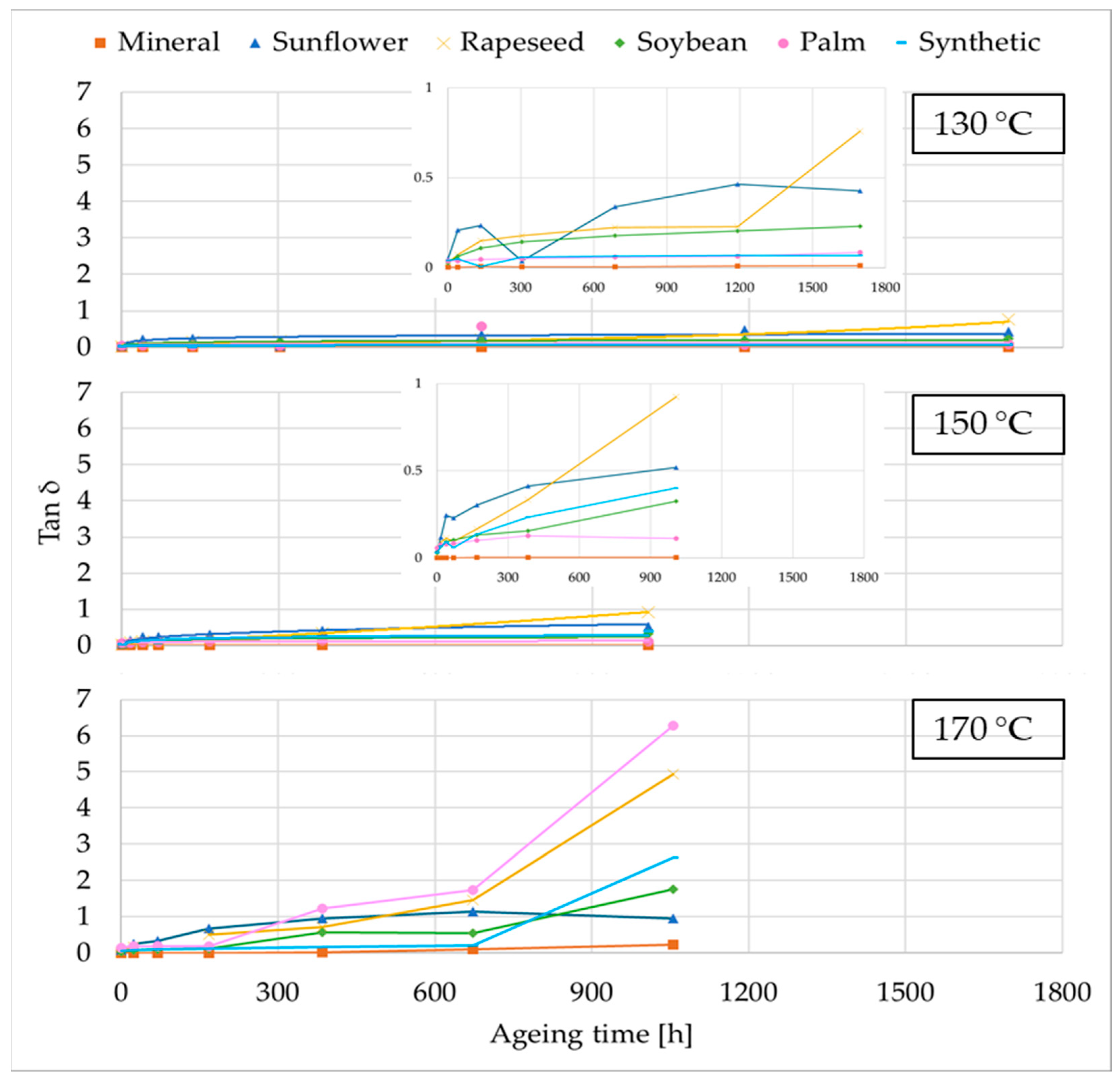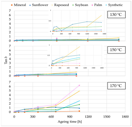 75]. Among them, the SE showed the highest initial losses, while the NE, including the palm-based fluid, started with similar values. Specifically, the tan δ of the new fluids was 0.0016 for MO, 0.0606 for sunflower, 0.0240 for rapeseed, 0.0296 for soybean, 0.0792 for palm, and 0.0438 for SE.
