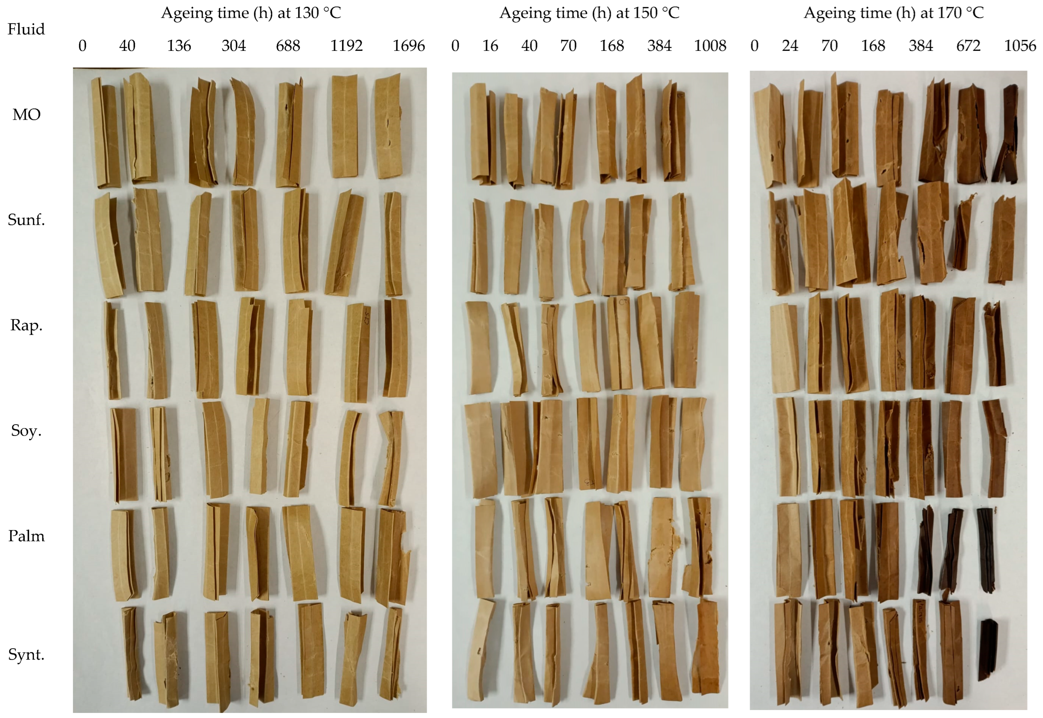 In the TUK paper samples aged with palm ester, a white residue appeared in the fluid after prolonged ageing (e.g., 1008 h at 150 °C), indicating excessive hydrolysis. This residue, only observed in this materials’ combination at 150 °C and 170 °C, points to a temperature-dependent degradation mechanism.