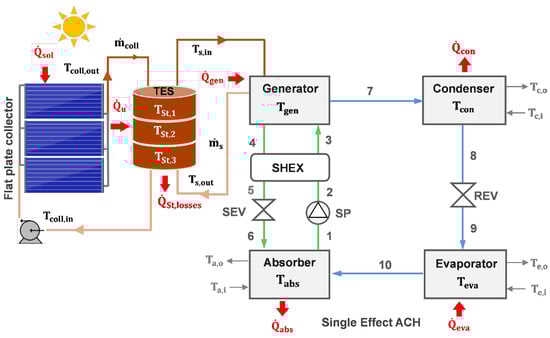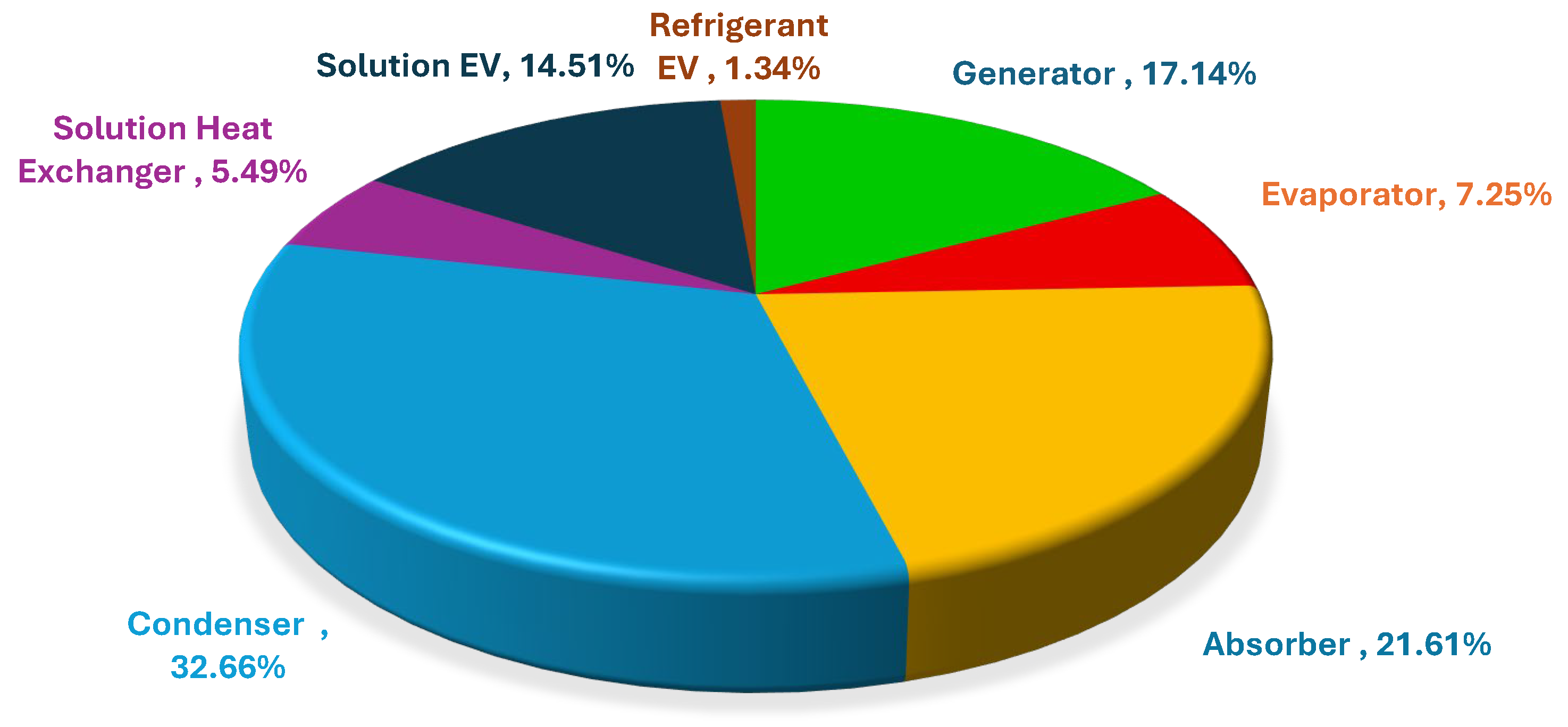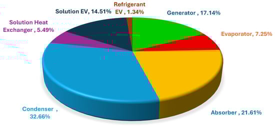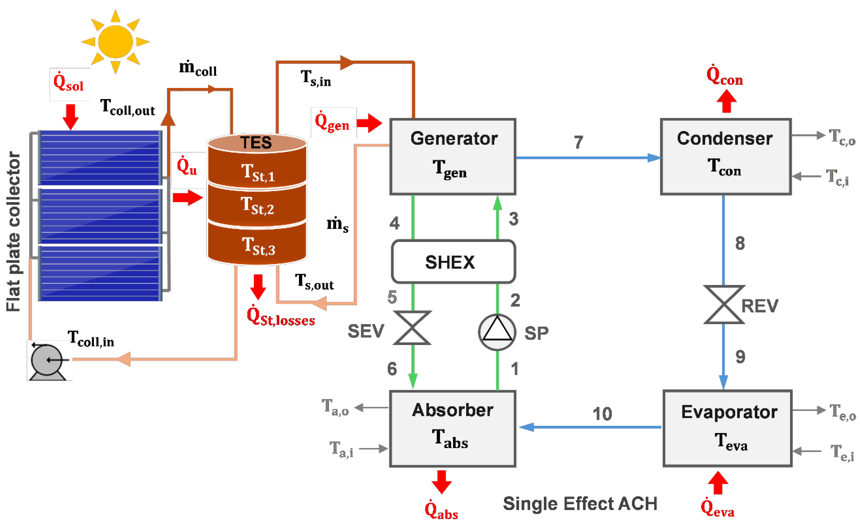 - Generation (GE)—Thermal energy (): The generator is powered by a heat source, such as solar energy or waste heat, which evaporates water from the LiBr solution (State 7). The produced high-pressure vapor is directed to the condenser, while the weak solution (State 4) is returned to the absorber.