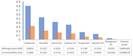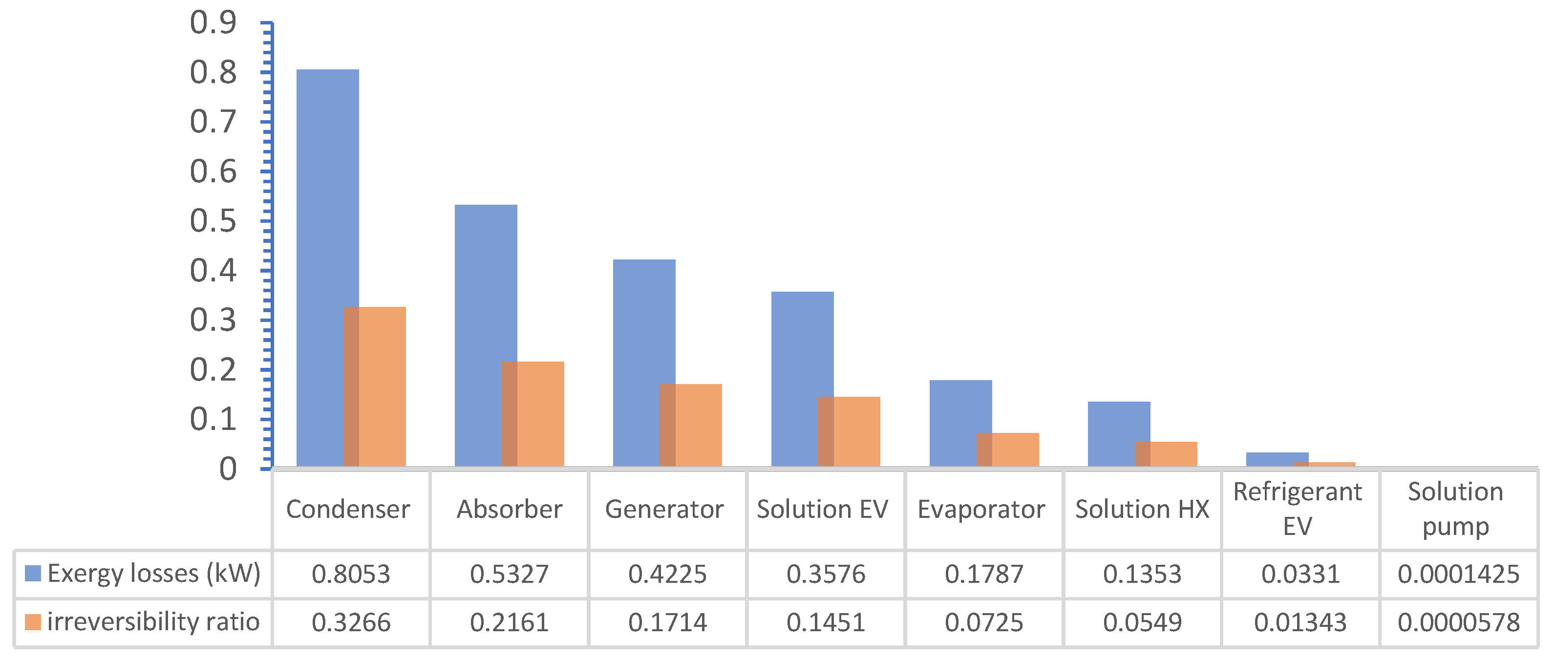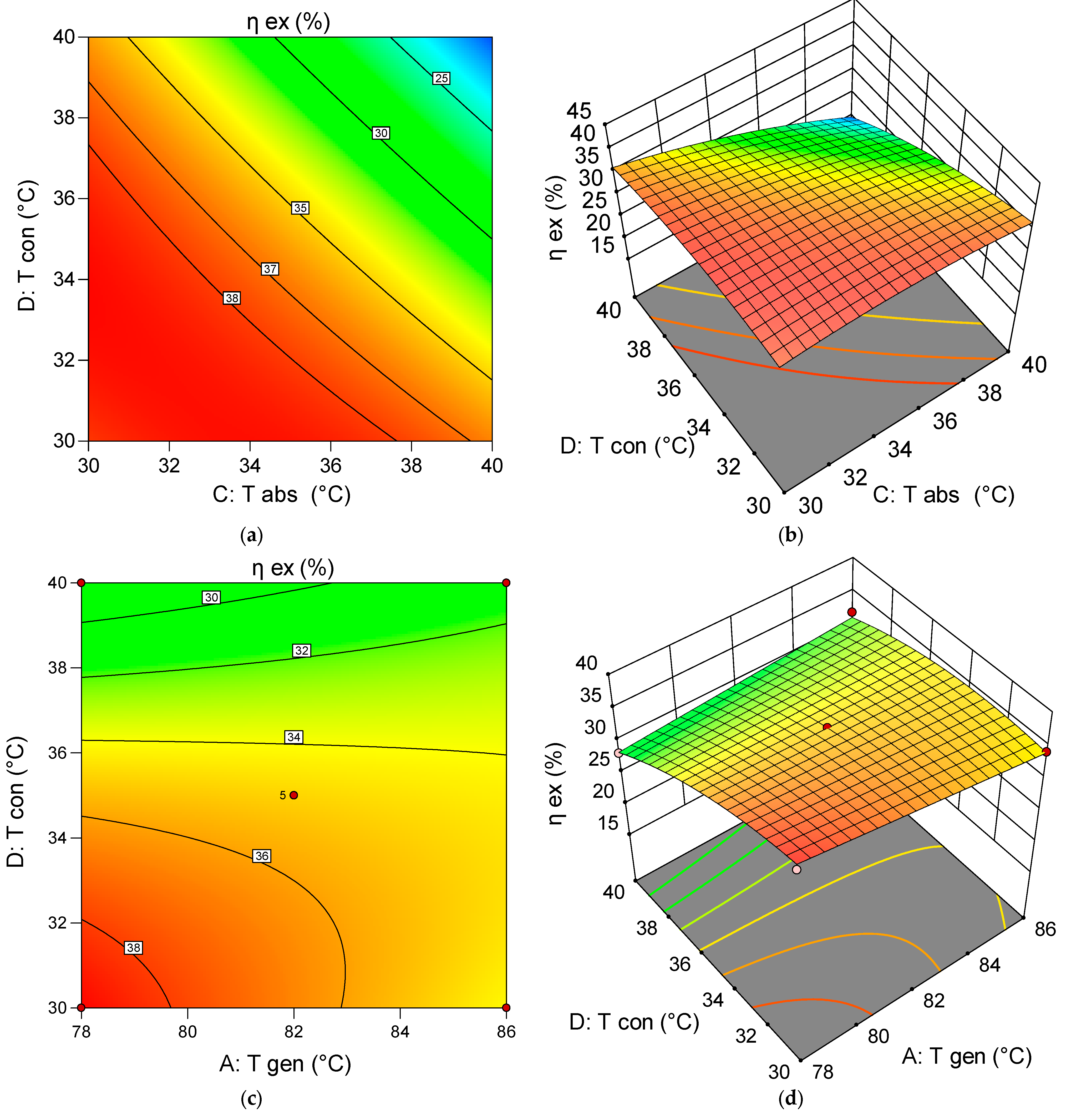 - The single-objective optimization for exergy efficiency identifies the optimal conditions at: = 82 °C, = 2.5 °C, = 30 °C, and = 35 °C, yielding an exergy efficiency of 39.29%.