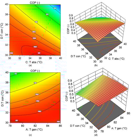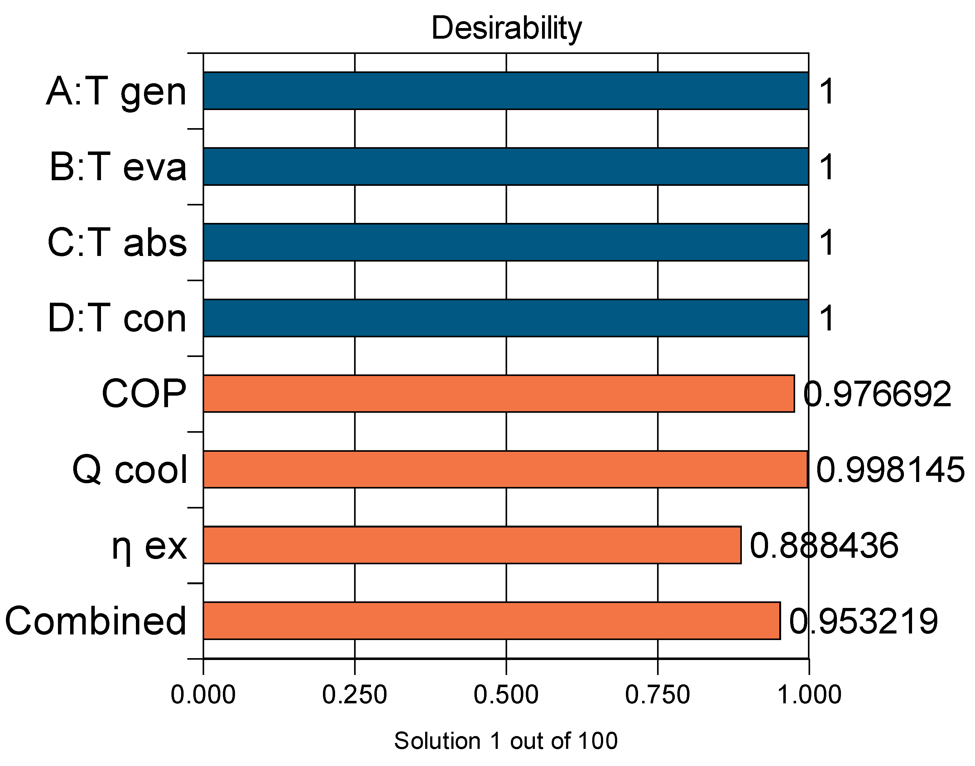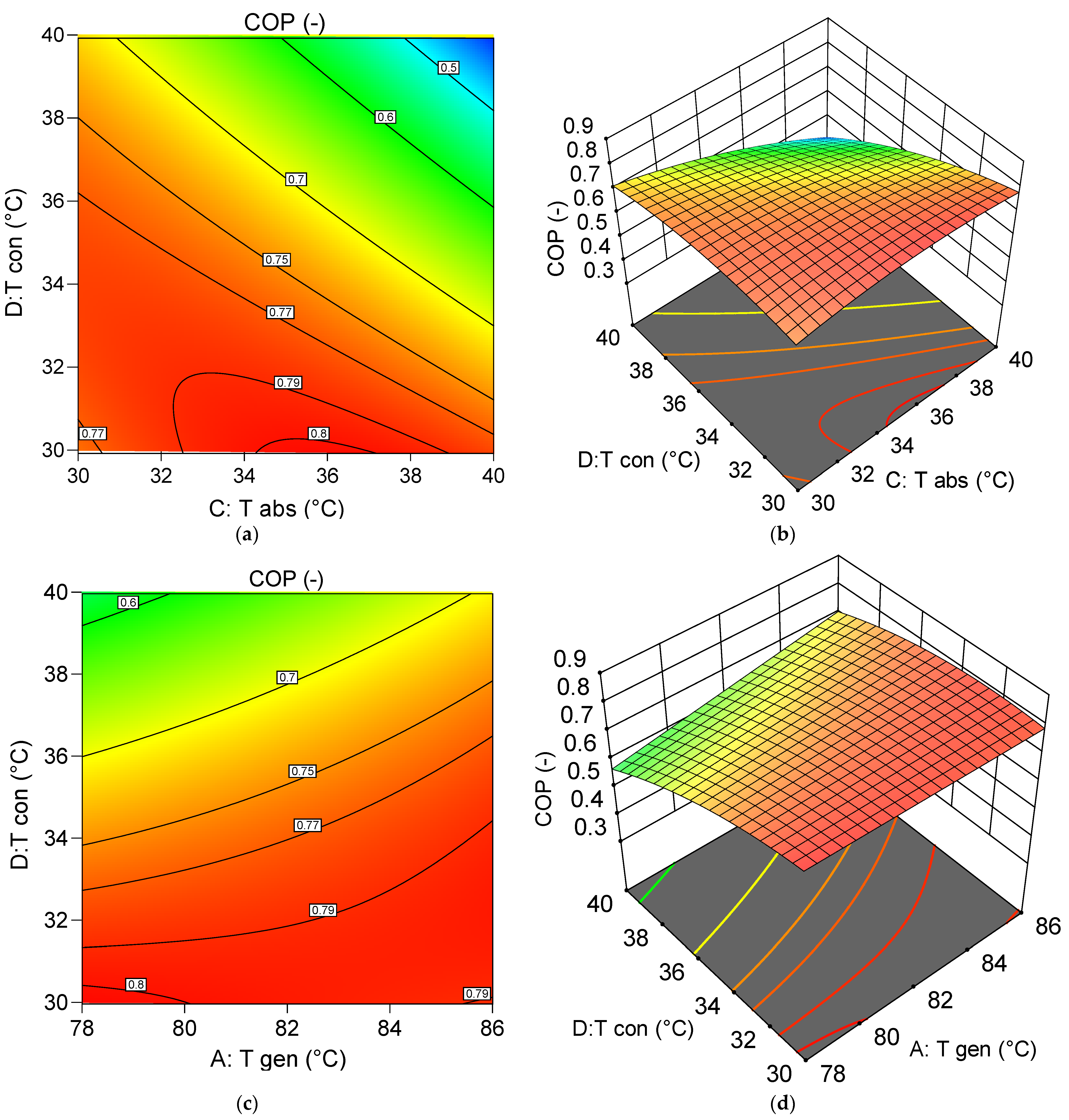 - For COP evaluation, the interactions − and have significant p-values but low F-values, indicating limited relevance. Nonetheless, a low absorber and condenser temperature, combined with a high generator temperature, results in an optimal COP of 0.8065.