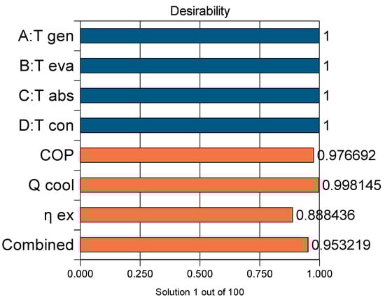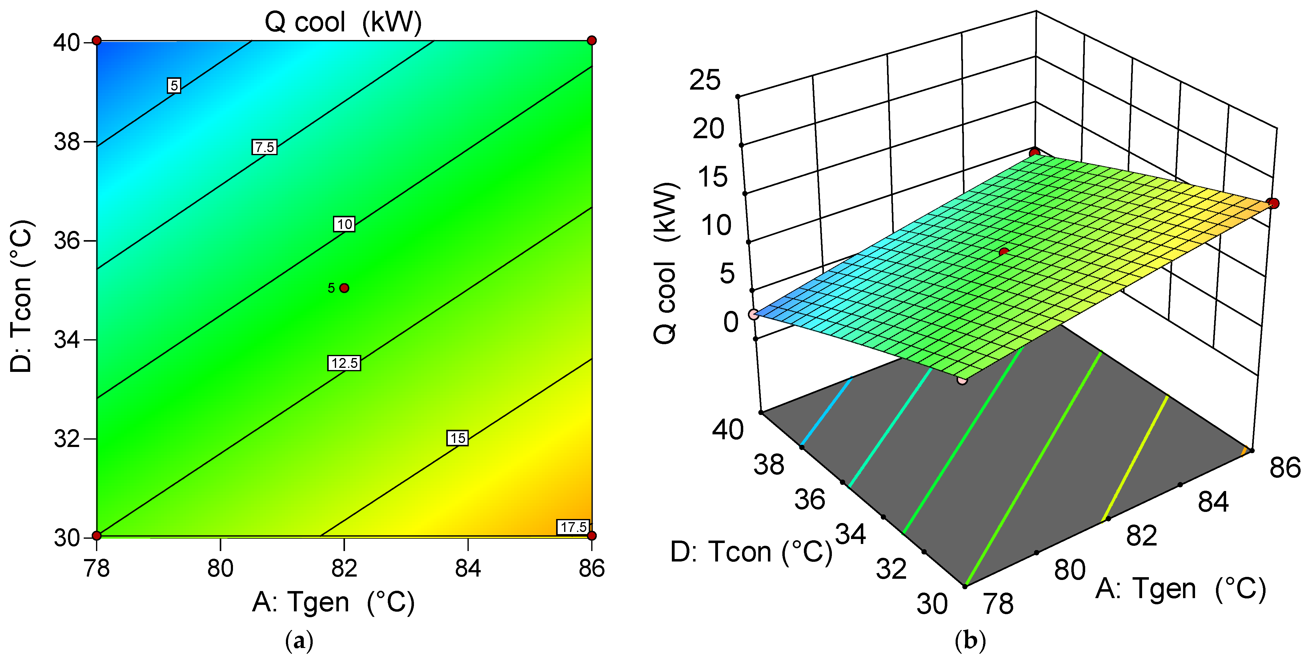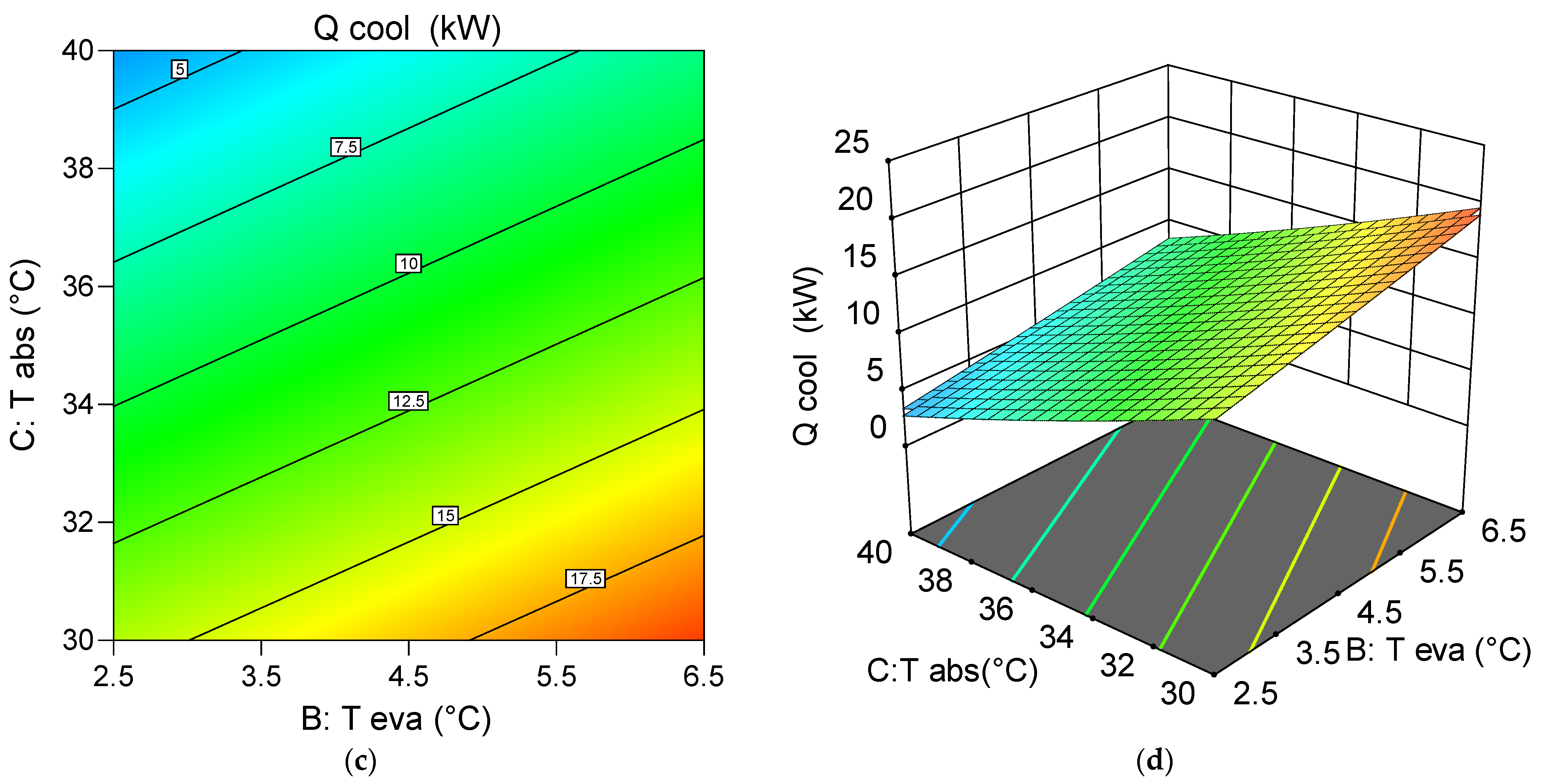 - In the multi-objective optimization, the RSM optimizer predicts optimal values of COP = 0.7969, = 20.68 kW, and = 36.93%, corresponding to = 78 °C, = 6.5 °C, = 30 °C, and = 30 °C.