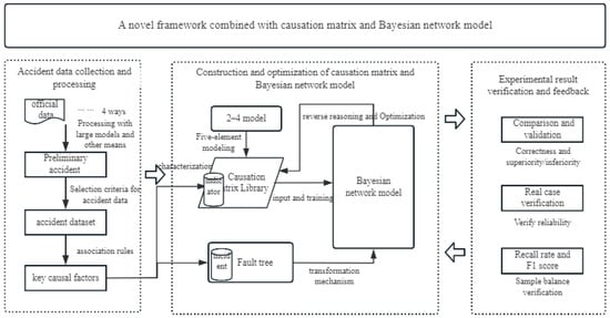 The causal factors of roof accidents are relatively complex. According to existing investigation reports, such accidents result from the interaction and combined effects of multiple factors, including human, material, environmental, and management factors. However, traditional accident analysis methods, such as fault tree analysis, struggle to capture the characteristics of dynamic interactions among multiple factors. This leads to lag and one-sidedness in existing preventive measures, which fail to meet the needs of precise prevention and control in modern coal mine safety production. To address this, this study proposes a new analytical framework integrating an accident causation matrix and a Bayesian network. As shown in Figure 1. This framework aims to break through the limitations of static analysis. By quantitatively evaluating factor correlations and dynamic changes, the framework provides scientific decision support for roof accident prevention, realizes the organic combination of qualitative characteristic description and quantitative probability reasoning, and, thus, promotes the transformation of roof accident prevention from passive response to active prevention.