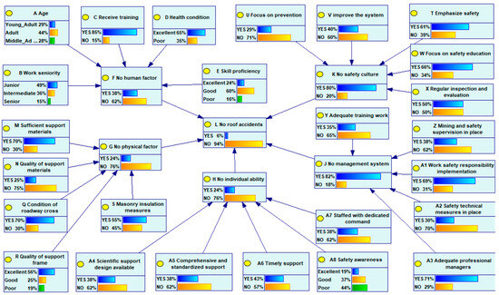 Sensitivity analysis can effectively identify key factors that have a significant impact on the target node and quantitatively assess the degree of influence of each factor on the target node. By comparing the magnitudes of these influences, targeted preventive measures can be taken against roof accidents. Taking node L “no roof accident” as the target node for sensitivity analysis, the sensitivity distribution as shown in Figure 5 can be obtained. In this figure, color intensity is proportional to the degree of sensitivity: a darker color indicates a higher level of influence that the respective factor has on roof accidents.