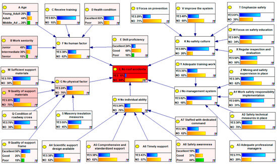 To further test the effectiveness of the model in practical applications, the study selected 10 roof accident cases that did not participate in model training as validation cases to conduct an in-depth research on the model’s validity. The specific experimental steps are as follows: after selecting 10 roof accident cases, the causal factors of each accident were first characterized to construct an accident causation matrix, followed by inputting the observed states of the root nodes into the model. Taking the “10 November” major roof accident in Houzitian Coal Mine, Liuzhi Special Zone, Liupanshui, Guizhou as an example, the causes of the accident are roughly as follows: failure to formulate safety technical measures for maintenance, weak risk prediction awareness, inadequate safety management, failure to strictly implement the system of tapping the roof and ribs to check for loose rocks, working under an unsupported roof, inadequate safety technical measures, chaotic management and blind command, poor quality of shed supports, inadequate supervision and inspection by the mine’s operational departments and safety supervision department, and failure to strengthen roof management. Taking the “management system” dimension in the accident causation matrix as an example for characterization: since no maintenance safety technical measures were formulated for the accident, the probability of the “NO” state of the corresponding node A2 was set to 100%; due to problems such as chaotic management, it was determined that no professional management personnel were allocated, so the probability of the “NO” state of node A3 was set to 100%. For the remaining nodes in the management system dimension, their state input was completed based on the above cause analysis, and the probability distribution of this dimension could be obtained. Subsequently, following the same method, the characterization results of the other four dimensions—human factors, material factors, individual capabilities, and safety culture—were input into the model, generating the corresponding dimension probability distribution diagram as shown in Figure 7. After the model calculation, the occurrence probability of this accident was finally determined to be 94.3%.