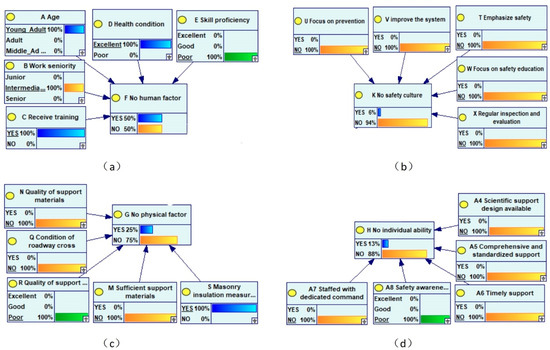 Probability distribution of partial variables in the “ 10 November” roof accident: (a) Description of the probability distribution of each variable in the human factors dimension; (b) Description of the probability distribution of each variable in the safety culture dimension; (c) Description of the probability distribution of each variable in the material factors dimension; (d) Description of the probability distribution of each variable in the individual capability dimension.