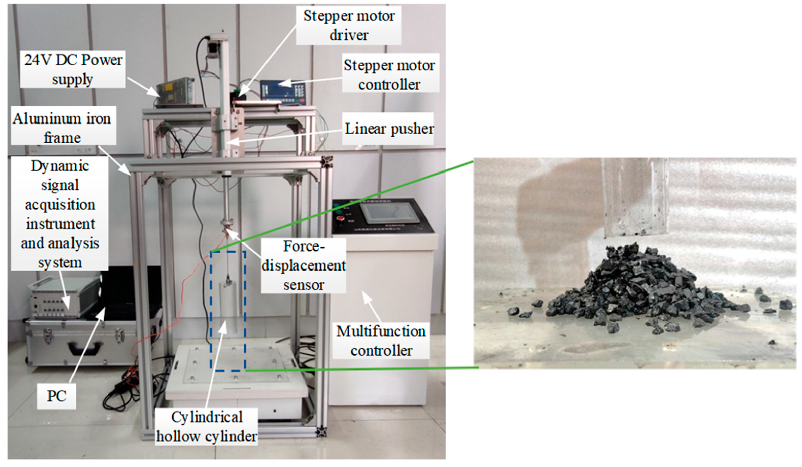The natural stacking method is a common approach for obtaining the static angle of repose. It refers to a process where particles are uniformly filled into a hollow cylindrical container with a through-hole; the container is then slowly lifted horizontally, allowing the internal particles to collapse uniformly and slowly to form an approximately conical accumulation body [27]. After the particles slide freely under gravity and form a stable accumulation, the internal angle between the conical surface and the horizontal plane is the angle of repose to be measured. The test bench for the static angle of repose is shown in Figure 5. First, particles are uniformly injected into a cylindrical hollow acrylic tube. Second, the stepper motor is controlled by a stepper motor controller, enabling the linear pusher to lift the linear pull rod upward. A 24 V power source ensures power supply throughout the entire experiment, and the motor controller can adjust the lifting speed and direction (the lifting speed is set to 5 mm/s in the experiment). When the hollow acrylic tube is lifted to a certain height, the coal particles previously contained inside will naturally fall downward under gravity. Finally, stacked coal particles are naturally formed at the bottom, and thus the static angle of repose is obtained.