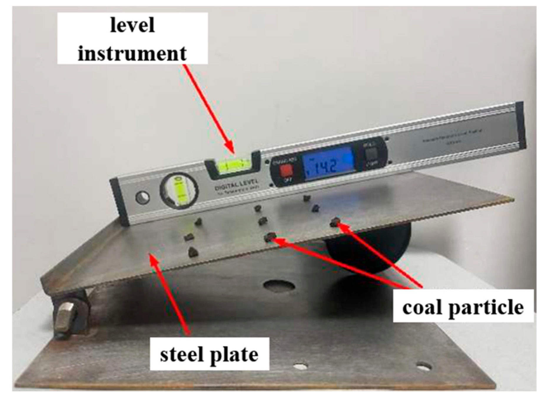 To simulate the movement of coal–rock particles on the drum surface in discrete element software, the static friction coefficient needs to be calibrated through the inclined plane lifting experiment. As shown in Figure 8, coal particles are uniformly spread on the surface of a movable iron plate, and the iron plate is lifted by moving the cushion block to increase the angle between the plate and the horizontal plane. Lifting is stopped when the coal particles just show a tendency to slide or start sliding. The inclination angle of the slope (i.e., the static friction angle) at this moment is measured with a level, and the tangent value of this angle is the static friction coefficient.