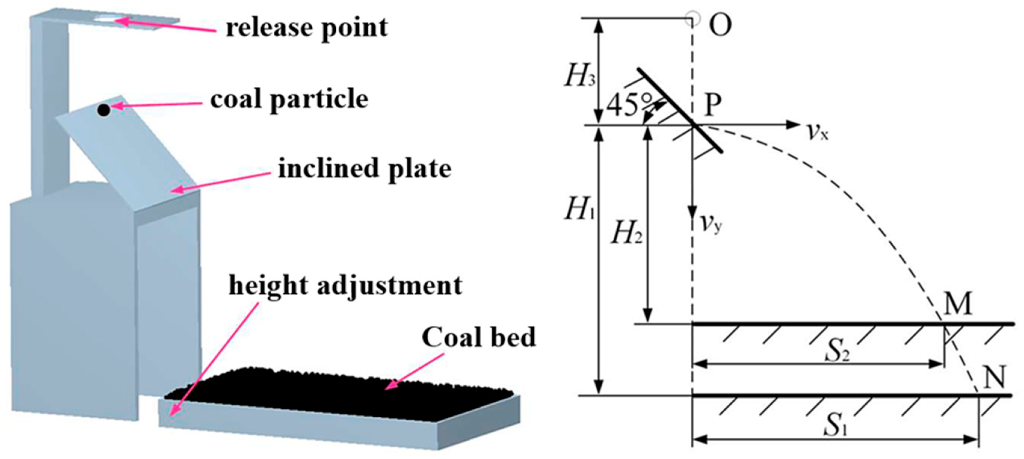 During the cutting process of the drum, collisions and ejections occur between coal particles and between particles and components such as the drum, and their coefficient of restitution directly affects the motion state of particles during transportation. This coefficient is defined as the ratio of the relative separation velocity of two objects along the normal direction after collision to the relative approach velocity along the same direction before collision. To ensure the accuracy of numerical simulation, this coefficient needs to be calibrated via an inclined plate collision test bench, whose working principle and numerical model are shown in Figure 9. In the experiment, coal particles fall freely from the release point O, collide with the upper surface of the inclined plate (with an inclination angle of 45°) at point P, then perform a projectile motion, and finally, fall on the base or coal bed. The final position of the particles is recorded, and the horizontal distance S and vertical distance H between the particles and the collision point P are measured; then, the horizontal component velocity vx and vertical component velocity vy of the particles after collision are deduced inversely using kinematic equations, and the coefficient of restitution is further obtained.
