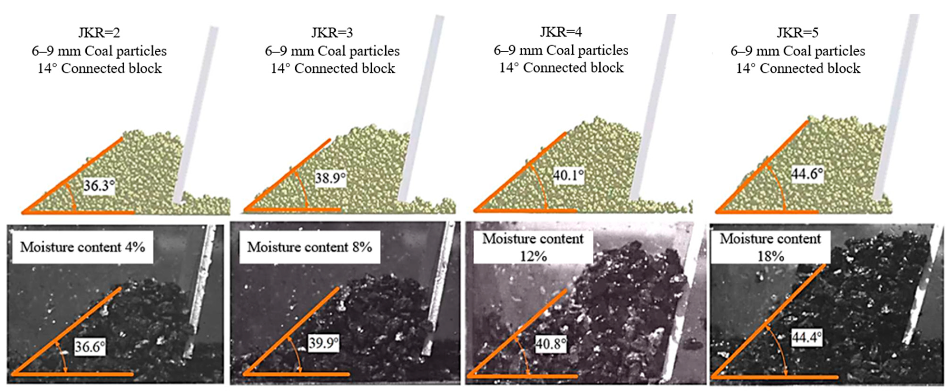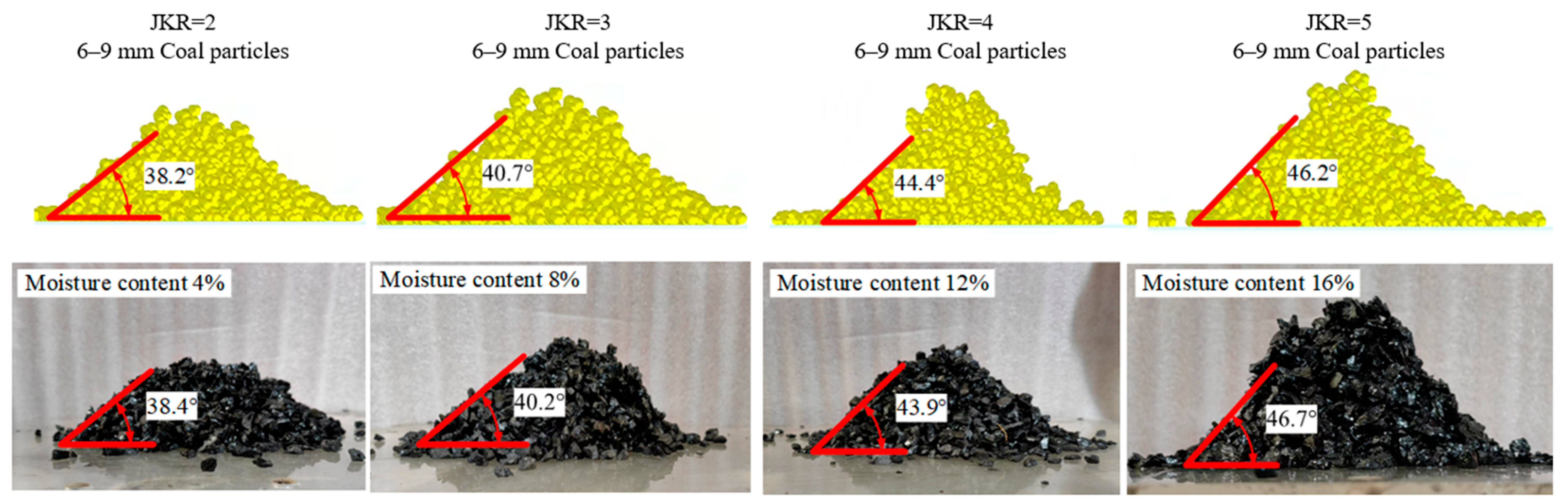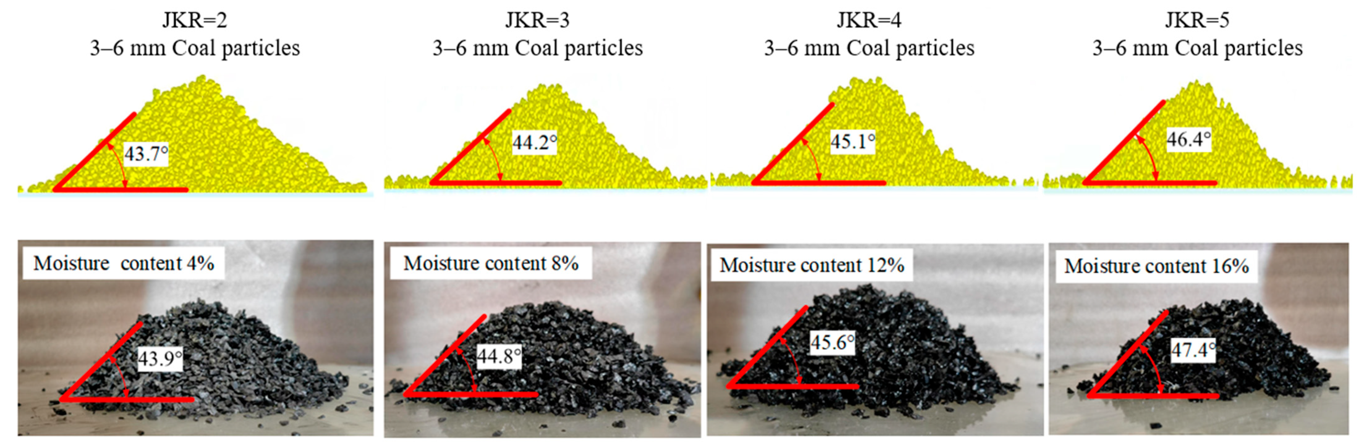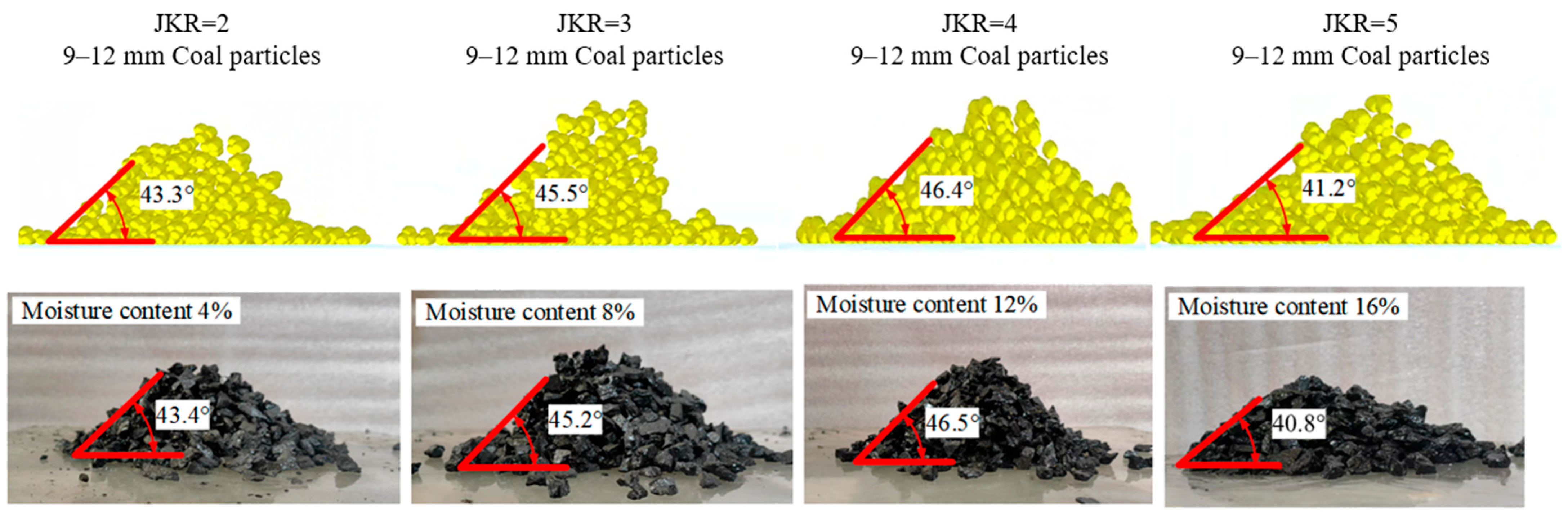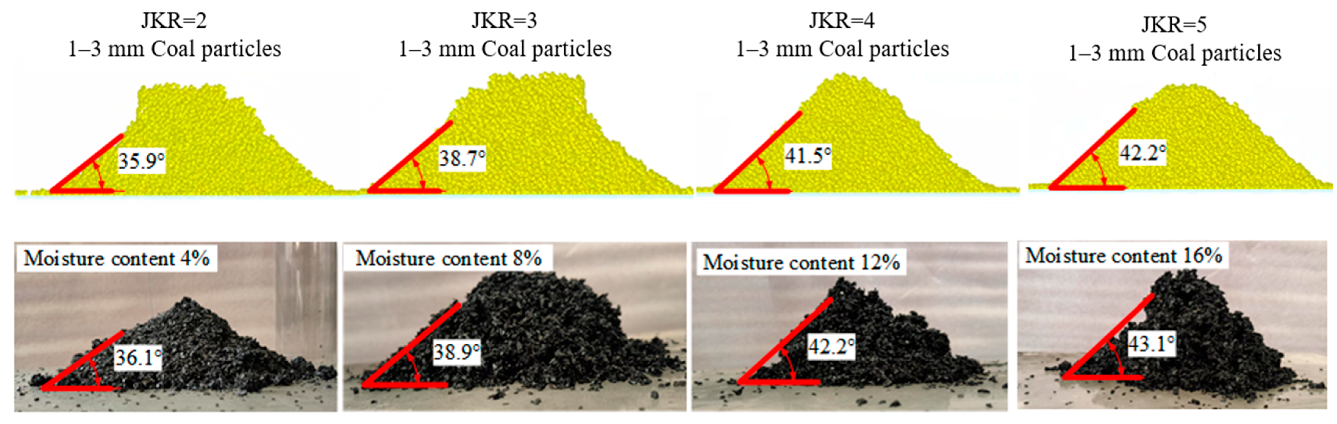 29. Chai, J.; Wang, S.; Zhou, Z.; Li, G.; Liu, X. Determination of the friction coefficient of coal particles by discrete element simulation and experimentation. Res. Sq. 2020. [Google Scholar] [CrossRef]